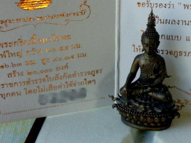 ผมมีเพื่อนเป็นตำรวจนะครับวันนั้นไปจองที่สถานีตำรวจเขาบอกว่ามีญาตมีเพื่อนไหมให้เขาจองให้แล้วไปจ่ายเงินที่เขา ผมก็ไปให้เพื่อนจองครับพิมพ์เงินเล็ก 1 องค์จะเอา 2องค์กวัวตังค์ไม่พอได้ยินกระทั้งเพื่อนโทรไปจองฟังจนจบครับเกือบ4-5นาทีตกลงกัน พอถึงวันรับ พระค่อยเอาเงินมาจ่ายค่าพระ แต่พอเขาถึงวันรับพระผมไปถามเพื่อน บอกว่า...บ่าได้วะบ่อฮู้เป็นหยัง ....(คิดในใจนะก่อพอฮู้ว่าราคามันขึ้นคิงก่อเอาไว้เองละก้า999เอาไปขายต่อกำไฮเป็นเท่า)พระรุ่นนี้ไผ่ทำมิดีมิชอบขอหื้อเป็นไปตามกำไผ๋ยักยอกขอหื้อตำแหน่งก่อโดนยักยอกไว้เน้อไผ๋ยักยอกขอหื้อยศอย่าได้ประทานแก่เขาตังหลายเน้อสาธุ