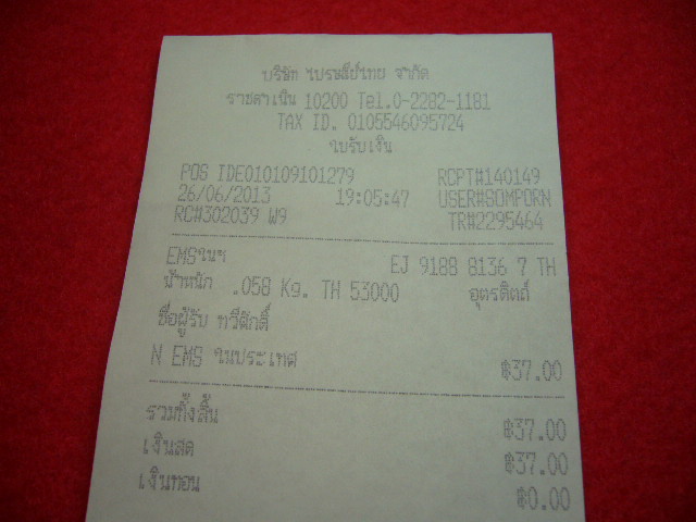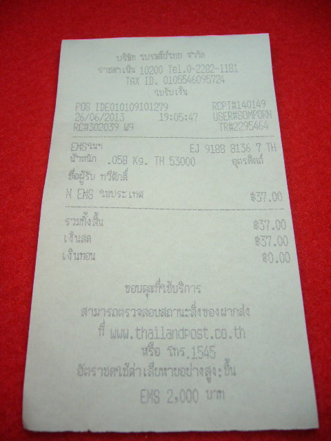 ส่งเหรียญโภคทรัพย์ หลวงพ่อทองดำ วัดท่าทองให้คุณเรียบร้อยแล้ว เมื่อวันที่ 26 มิถุนายน พ.ศ. 2556 เวลา19.05 นาฬิกา พระจะถึง ไม่เกิน 3 วันทำการ EMS ณ ที่ทำการไปรษณีย์ราชดำเนิน รายละเอียด ตามใบเสร็จ ของไปรษณีย์ข้างต้นนี้ ตรวจสอบสินค้าของท่านได้ ครับ