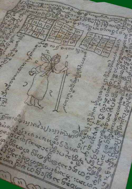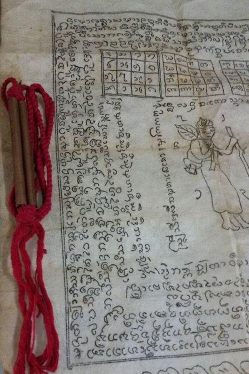ผ้ายันต์จารมือกระดาษสาสิวลีพร้อมตะกรุดห้อยคอ ครูบาสม เก่าๆเลยครับ